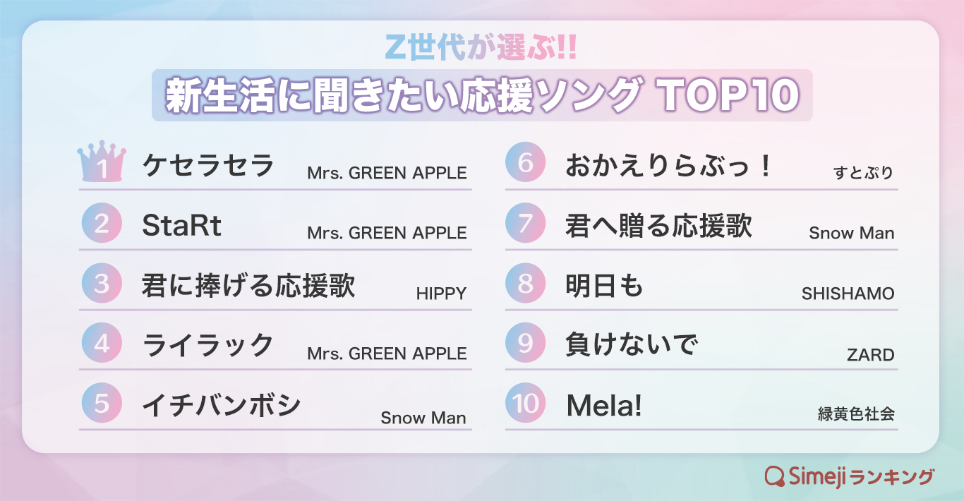 今回のランキングには、前向きなメッセージと力強い歌詞が印象的な応援ソングが集まりました。特に、「ケセラセラ / Mrs. GREEN APPLE」や「StaRt / Mrs. GREEN APPLE」など、新生活を前向きに始めるための元気を与えてくれる曲が目立ちました。また、「負けないで / ZARD」や「君へ贈る応援歌 / SnowMan」など、逆境に立ち向かう力を与える歌詞が多くの支持を集めています。さらに、「Mela! / 緑黄色社会」や「明日も / SHISHAMO」など、明るく元気をくれる曲調が特徴的で、聴く人に勇気とエネルギーを与える応援ソングが勢揃いしました。新生活にぴったりな曲が揃った今回のランキングは、背中を押してくれる一曲ばかりです。