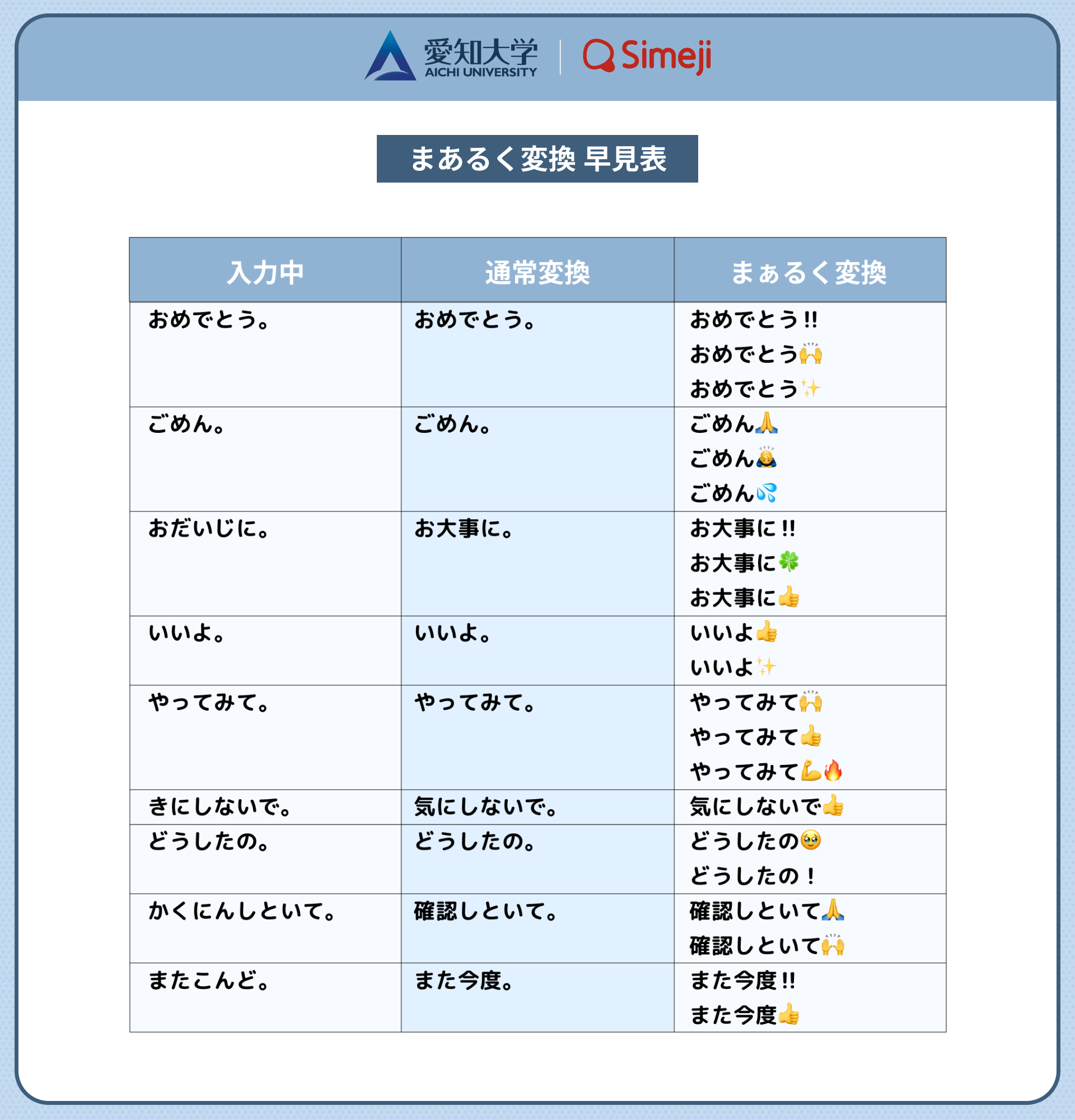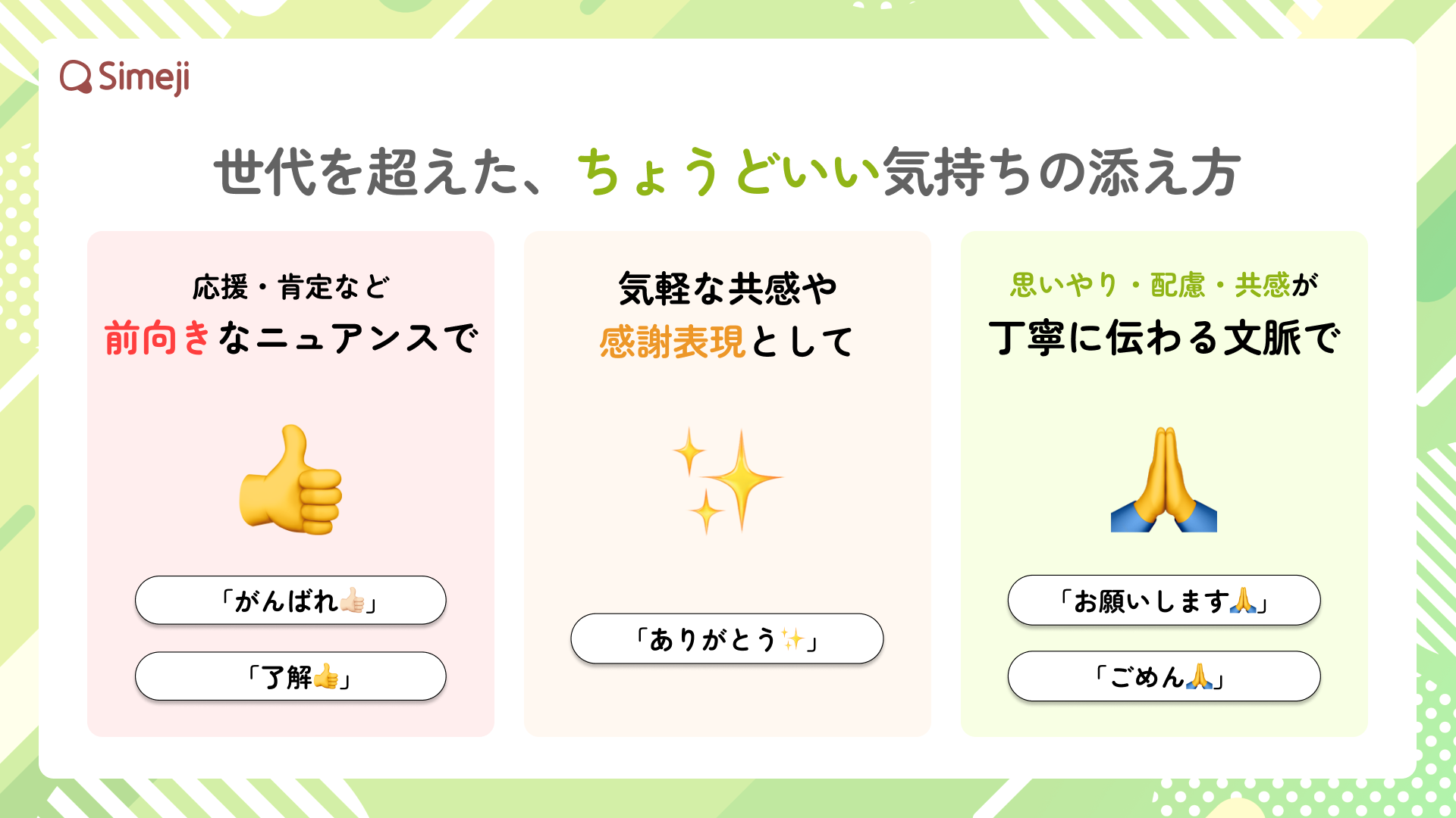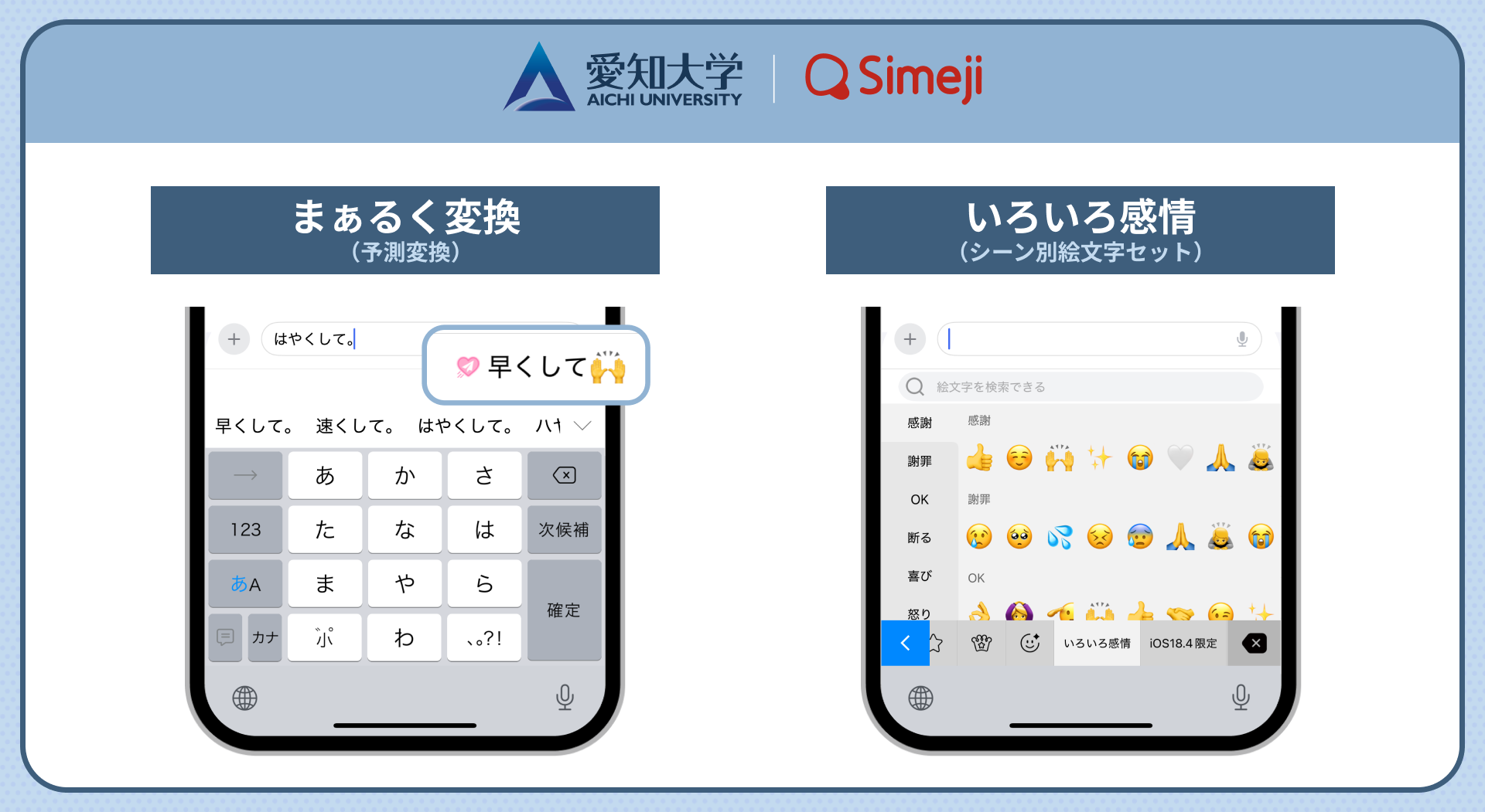 Simejiは、愛知大学の学生研究チーム「JAWS」と共同で取り組む「マルハラをまぁるくプロジェクト」より、ユーザーの感情表現をサポートする新機能を2025年5月にリリースしました。