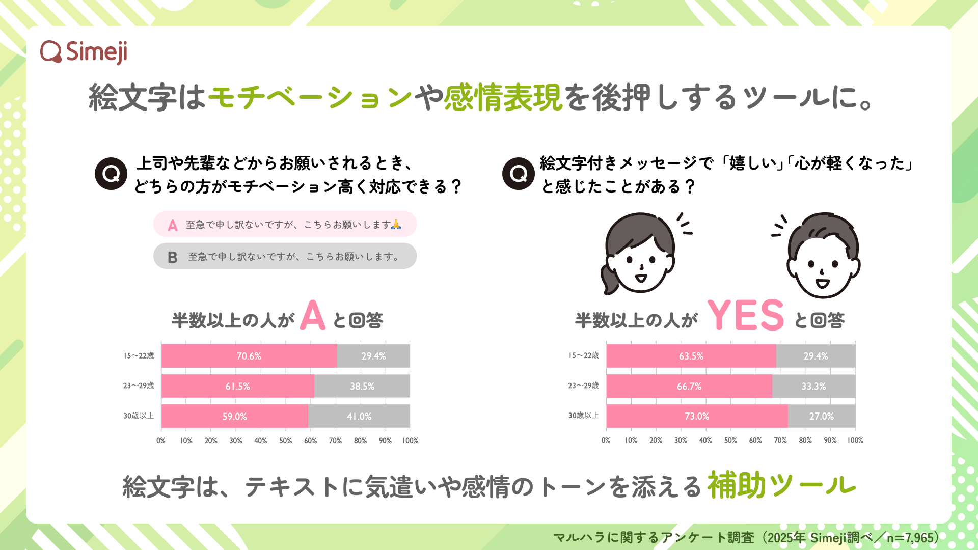 全国7,965名から回答が集まり「句点」や「絵文字」などのテキスト表現に対する受け取り方の違いが、世代や立場によって異なることが明らかになりました。本調査は、テキストコミュニケーションにおける“言葉の受け取り方”や“表現に対する温度差”を明らかにし、より快適なやりとりを実現する機能開発に活かすことを目的としています。