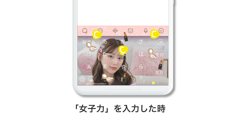 入力エフェクト機能とは、ユーザーが文字を入力し、変換候補より特定のキーワードを選択することで画像がキーボード上に現れる機能です。「女子力」や他の関連ワード入力することで可愛いイラストがキーボード上に現れます。