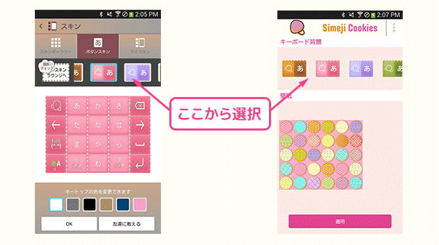 「Simeji Cookies」をダウンロードすると、Simeji本体のボタンスキンにスキンが追加されます。