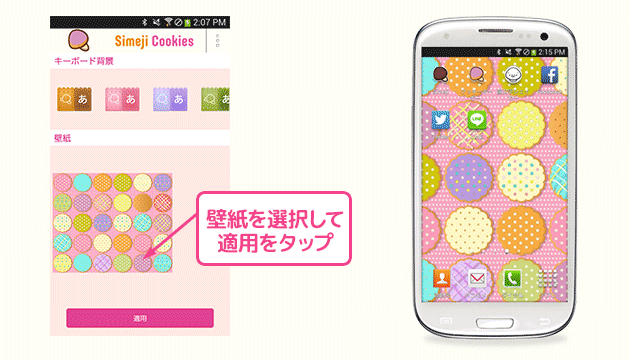 「Simeji Cookies」アプリを起動し、壁紙を選択してから「適用」をタップすると、ホーム画面の壁紙を変更することができます。