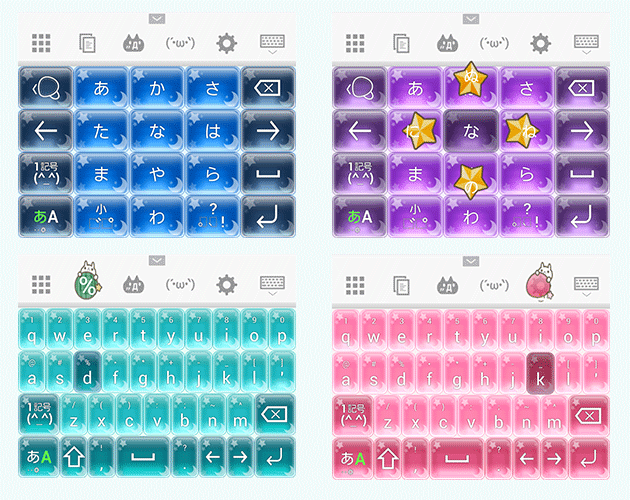 APKをダウンロードすると、4色の星柄のボタンスキンがAPK・Simeji本体の両方から設定できるようになります。( ^-^)っ⌒☆。.