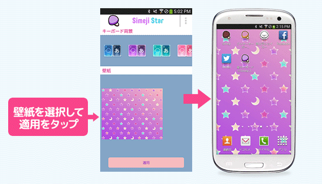 「Simeji Star」アプリを起動し、壁紙を選択してから「適用」をタップすると、ホーム画面の壁紙を変更することができます。