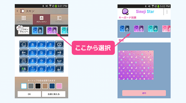 Google Playより「Simeji Star」をダウンロードすると、APKから直接起動するか、Simeji本体のボタンスキンにスキンが追加されますので、通常のボタンスキンを設定するようにスキンを変更してください。