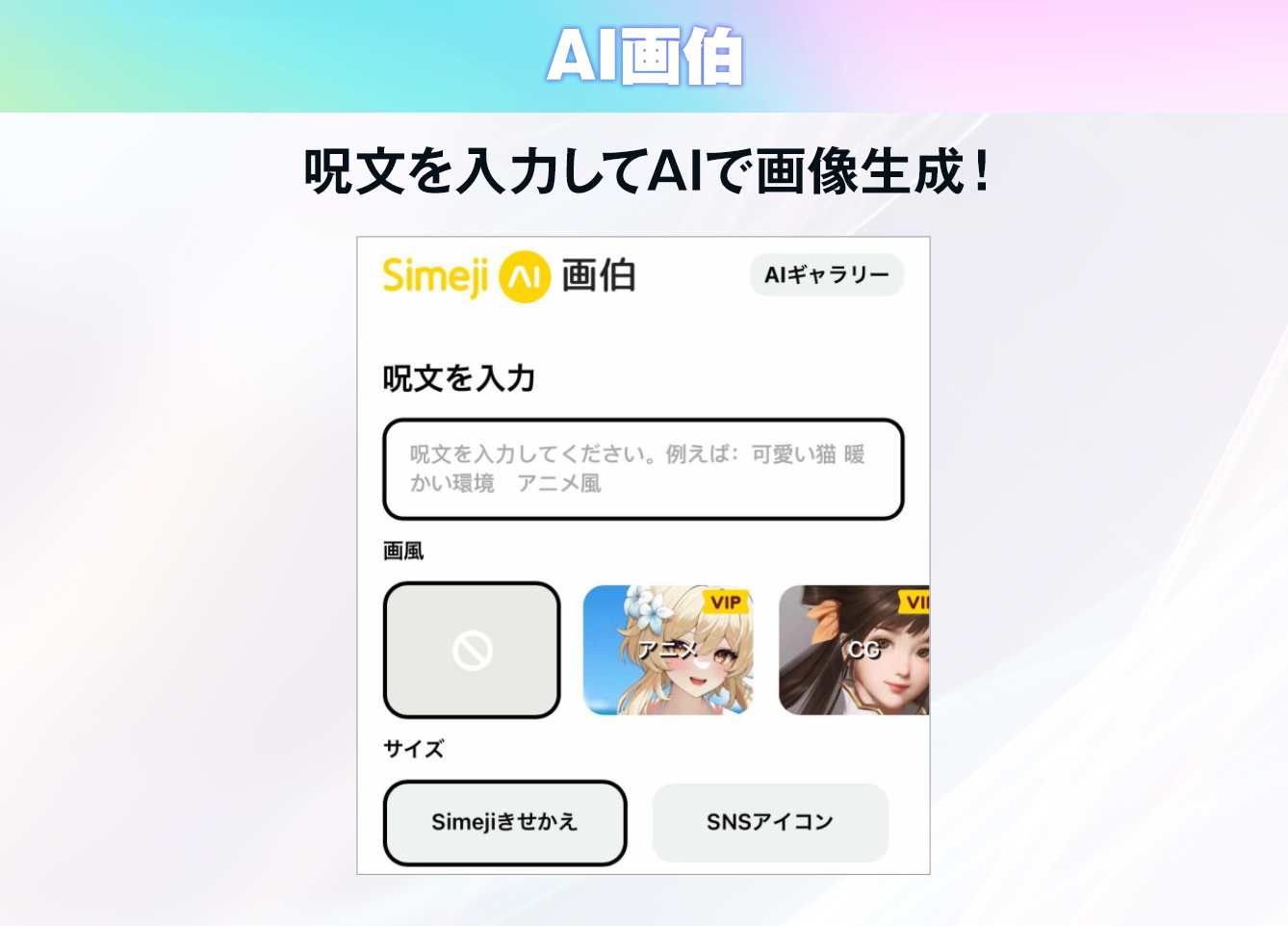 入力した呪文に沿って、AIが画像を自動生成する新機能。例えば、「笑っている猫」と入力すると、AIが呪文をもとに画像を自動生成します。入力する呪文によって生成される画像は異なり、同じ呪文を入力した場合もその都度違うものが生成されます。無数に画像を生み出すことが可能!SimejiきせかえやSNSアイコンとしてぜひ活用ください。