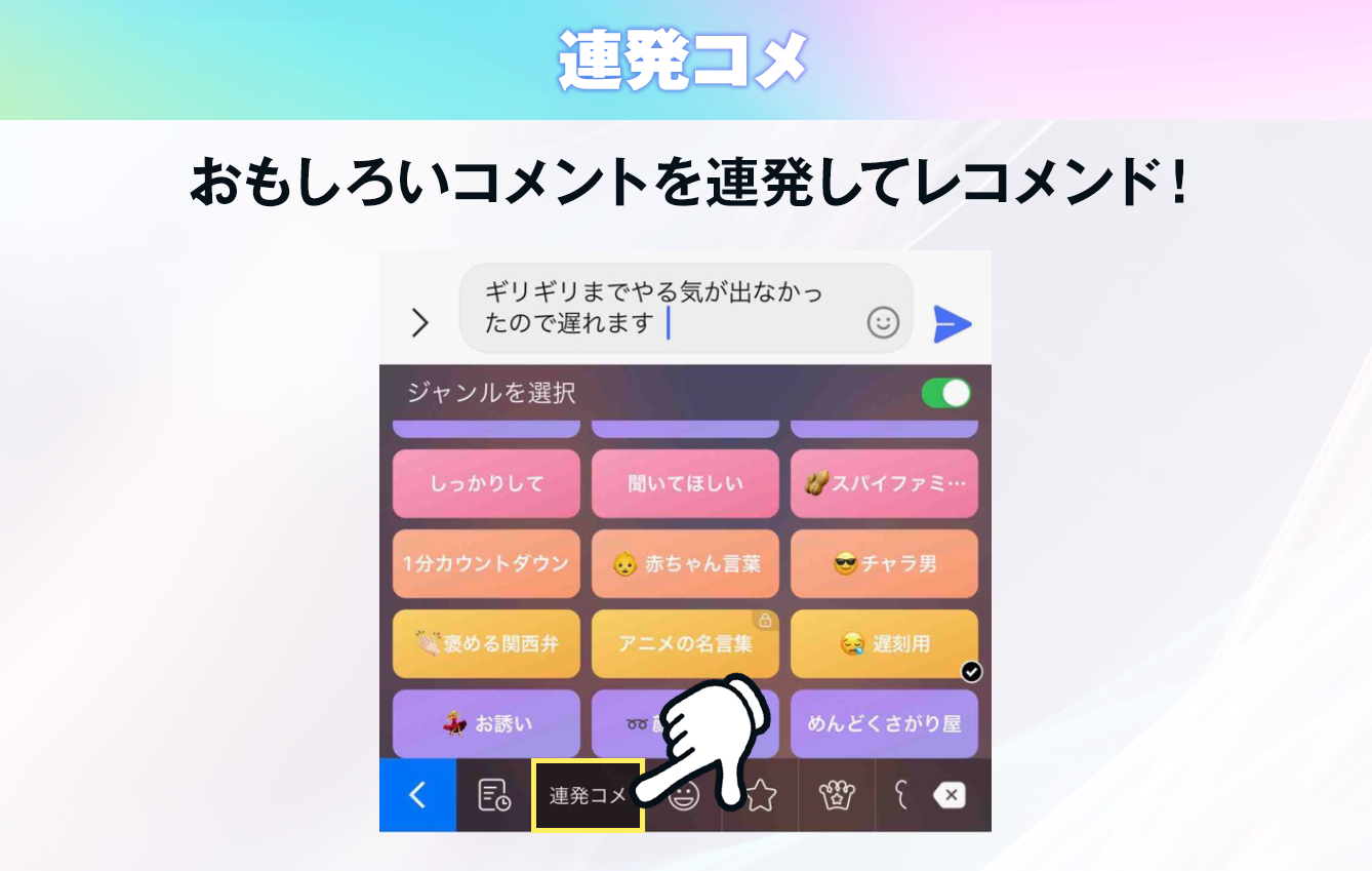 相手になにをコメントして良いか迷った時は連発コメ!感情にあったジャンルや話題のジャンルを選ぶだけで面白いコメントを連発して自動レコメンド。