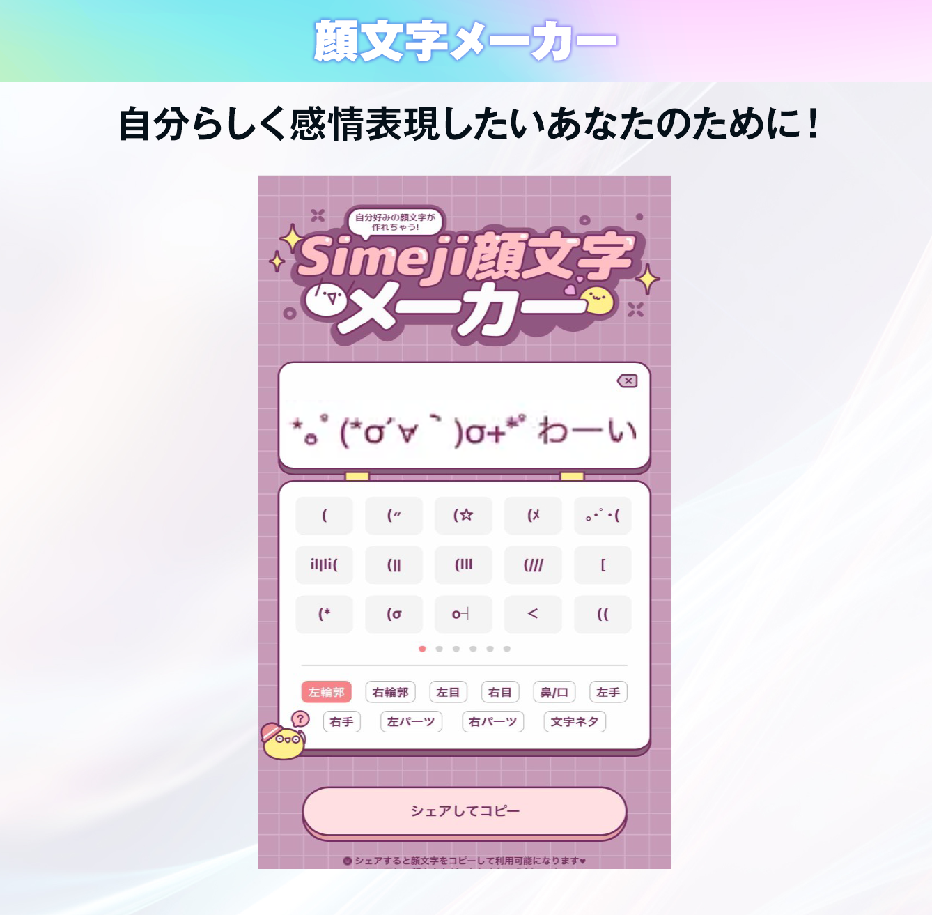 「オリジナルで顔文字がつくりたい!」というユーザーからのリクエストで開発が進み実現した「顔文字メーカー」。顔文字まで自分らしくカスタマイズすることが可能!顔パーツの他、文字ネタコンテンツも充実しているため、オリジナリティ溢れる顔文字作りをお楽しみいただけます!