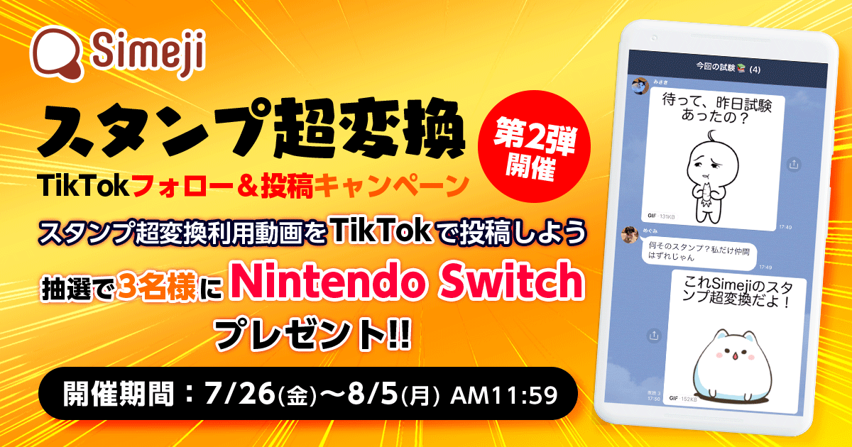 Simeji公式TikTokアカウントをフォロー、Simejiスタンプ超変換機能を使った動画に #スタンプ超変換 をつけてTikTokに投稿しよう!抽選で3名様に、Nintendo Switchをプレゼント!